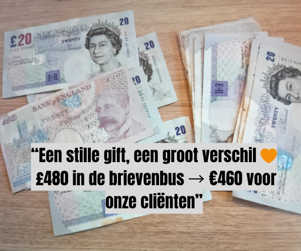 Soms zit het geluk in een klein gebaar. Op 27 maart vonden we een bijzondere verrassing in onze brievenbus: een envelop met daarin maar liefst 480 Engelse ponden. Geen naam, geen kaartje, geen uitleg – alleen een stil gebaar van betrokkenheid.